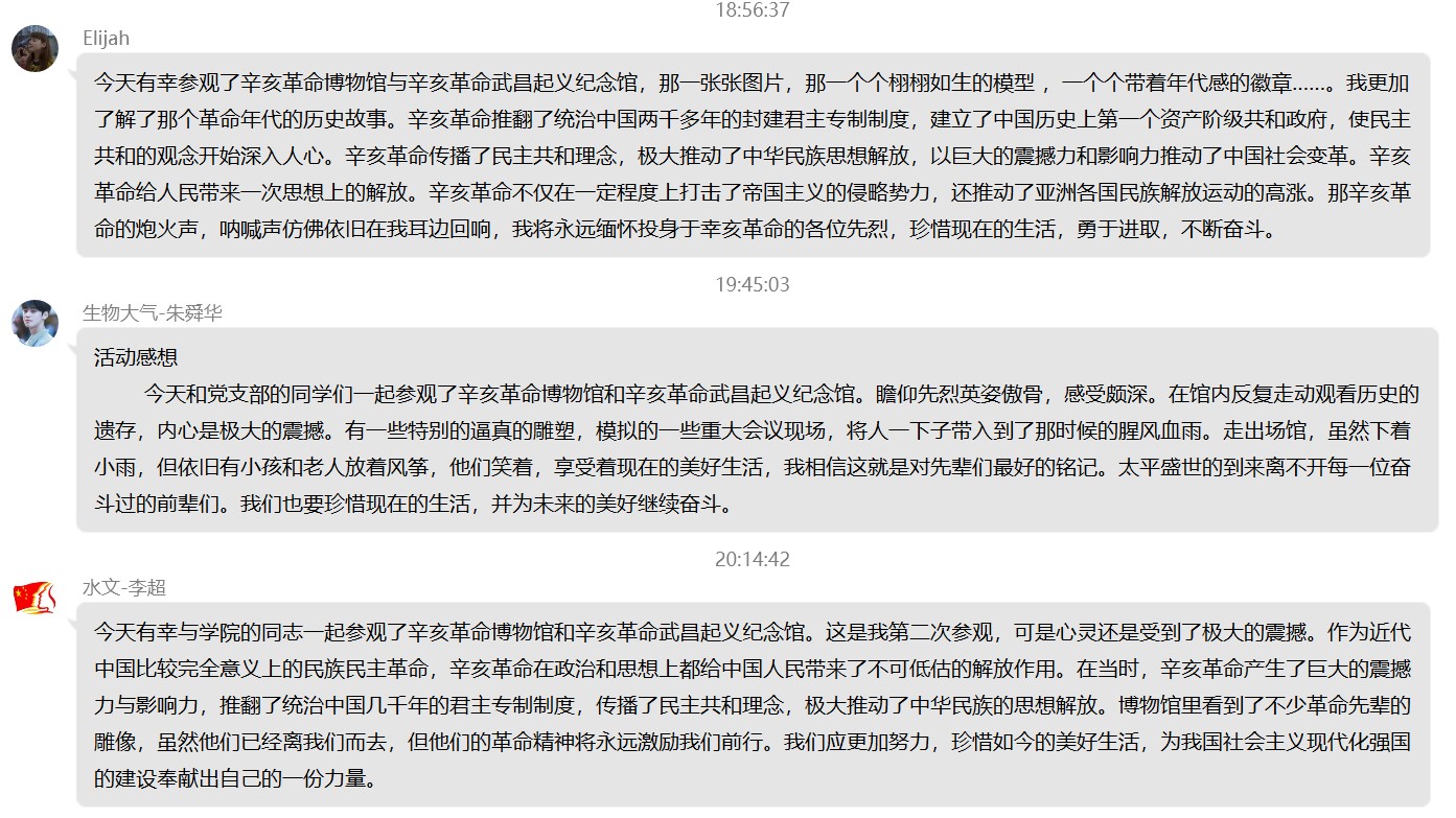 环境工程专业大学生党支部的黄文怡同志表示:我们要深刻缅怀这段可歌可泣的革命历史,缅怀革命先烈的光辉业绩,弘扬辛亥革命精神,激励中华儿女为实现祖国的和平统一,为中华民族的伟大复兴而努力奋斗。