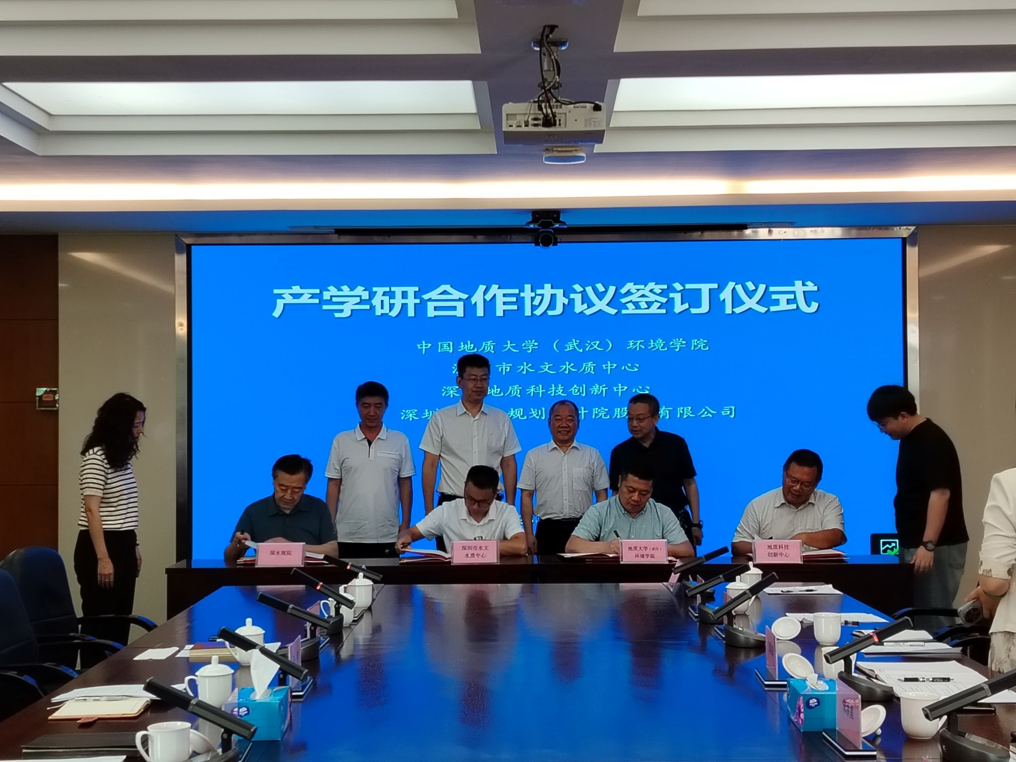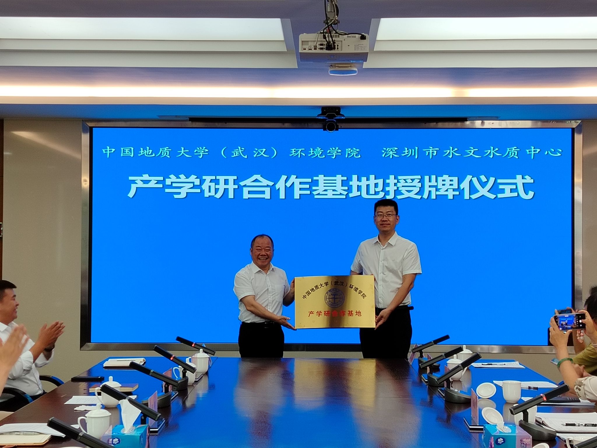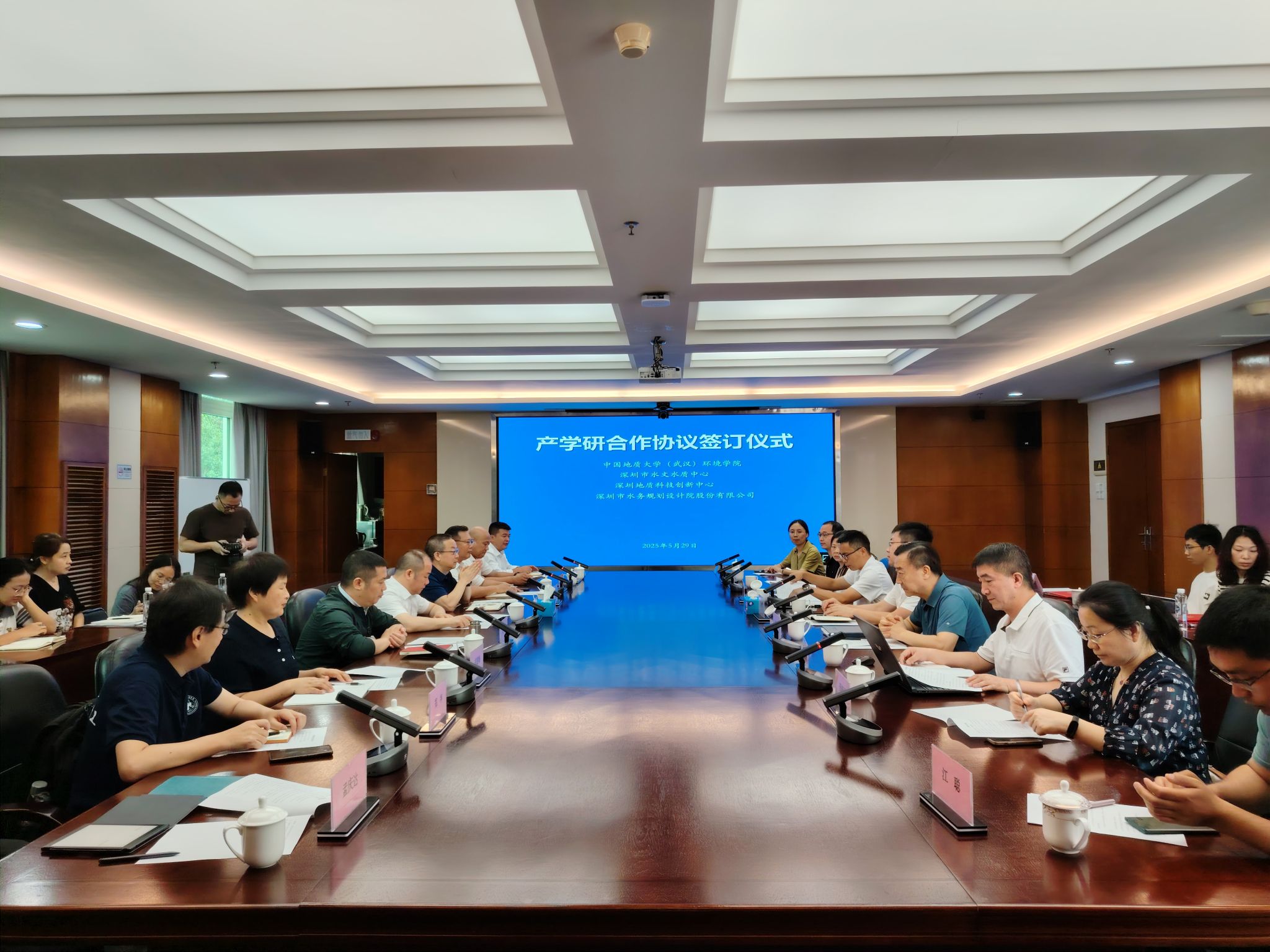 29日上午,学院与深圳市水文水质中心、深圳地质科技创新中心、深圳市水务规划设计院股份有限公司等三家单位共同举行产学研合作交流座谈会。三家单位相关领导出席座谈,深圳市水文水质中心副主任郜银梁主持会议。