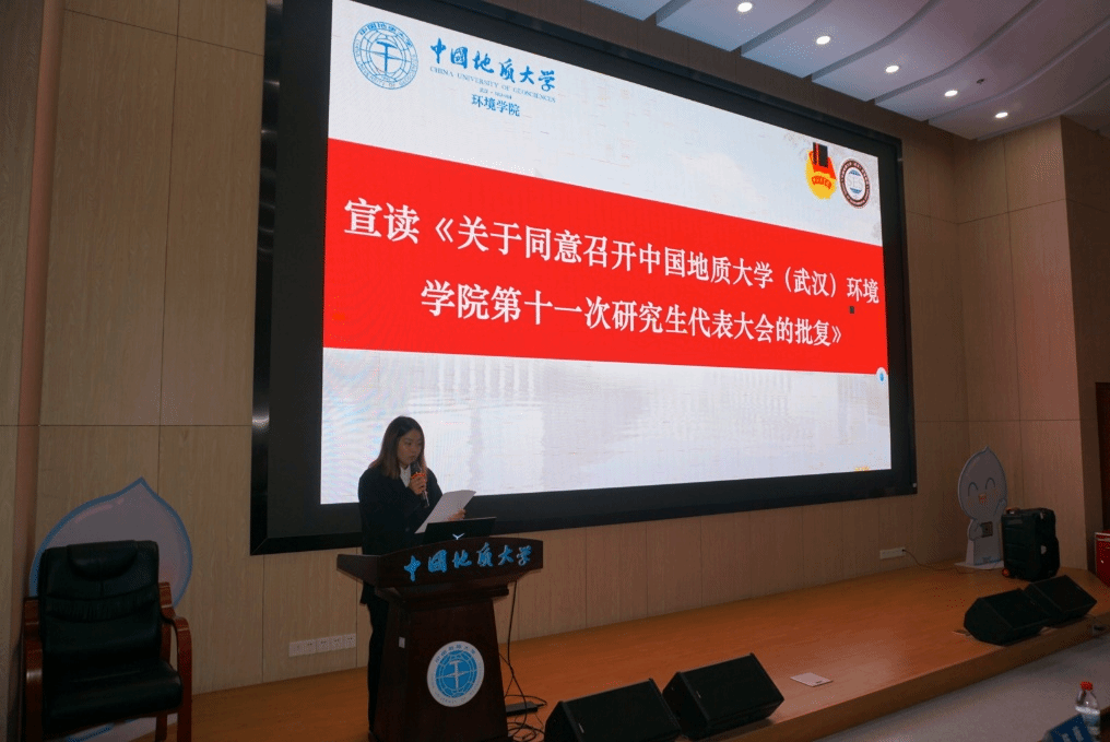 校研究生会主席团成员陈薇宣读《关于同意召开中国地质大学(武汉)p站视频 第十一次研究生代表大会的批复》。