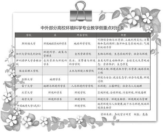 王焰新:整体上看,世界各国大学环境科学专业教学各有侧重,各具特色(如上表)。可以看出,美国大学的环境科学专业多具有地球科学、资源科学或工程科学背景,英国大学的环境科学专业多具有地理学背景,中国大学的环境科学专业背景复杂,分别来自化学、地学、生物学等,多具有环境化学背景。不同的侧重和特点,无疑会引导各国大学环境科学未来的发展与人才培养的方向。
