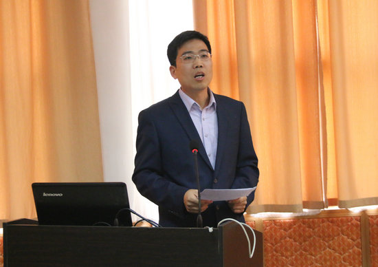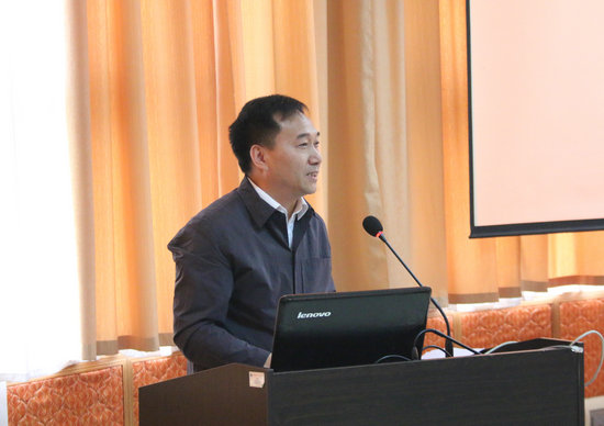 中国气象科学研究院研究生部主任王欣讲话。他介绍了中国气象科学研究院的基本情况。他说,中国气象人,职责重大,使命崇高,同学们不会后悔选择这一崇高事业。希望同学们打好基础,将来有机会加入到中国气象局和中国气象科学研究院工作。