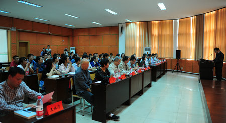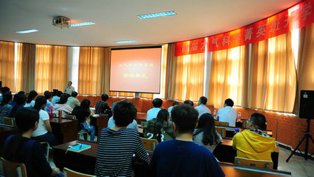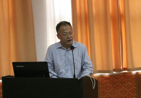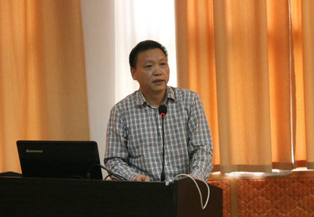 中国科学院大气物理研究所副所长程新金讲话。祝贺中部地区第一个大气科学菁英班落户我校。他介绍了中国科学院大气物理研究所基本情况,欢迎同学们将来进入大气所进行学习、科研和工作。他希望同学们多交流,培养团队意识,做好学问做好人,成为对国家社会有用的人。