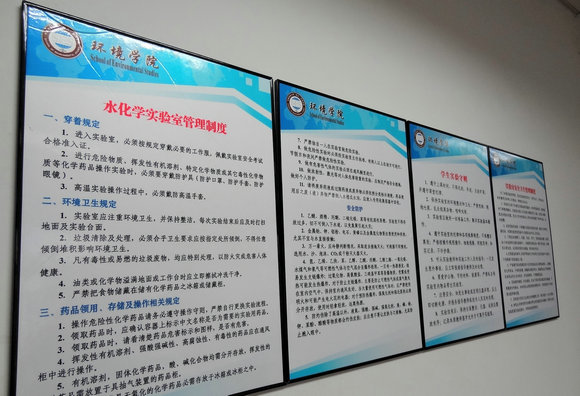 现有3个博士后流动站(含1个共建站)、2个一级学科博士点和4个一级学科硕士点,涵盖5个博士点、7个硕士点以及4个本科专业,涉及的学科门类较多,因此,教学与科研实验室涉及类型较多,包括有危险化学品类、辐射类、生物类等,学院实验中心根据各实验室的特点与要求,从防护措施、安全警示、安全教育、安全检查、应急预案等方面分别制订出各实验室特有的规章制度,并对所有实验室开展制度上墙工作。