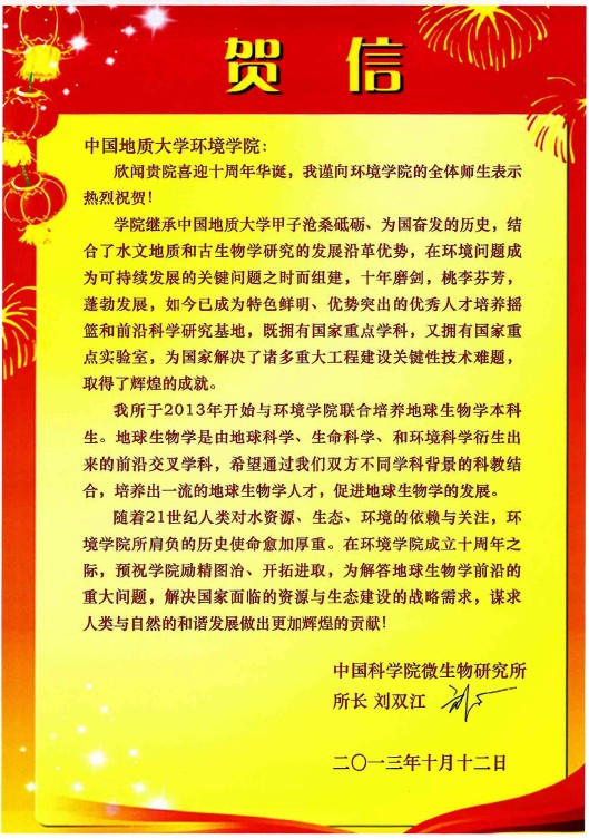 中国地质大学(北京)水资源与p站视频 发来院庆贺信