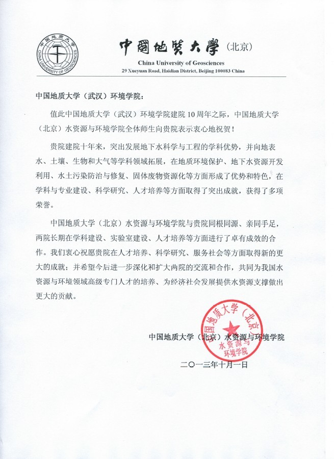 中国地质大学(北京)水资源与p站视频 发来院庆贺信