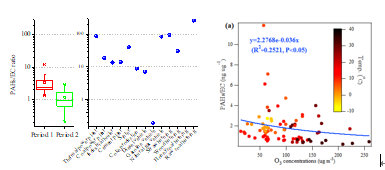 图3 两个阶段大气PM2.5的老化(左图)及与O3和温度的关系(右图)