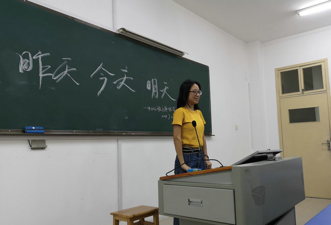 前任学生会主席郭文杰同学发言,她总结到自己在大学开始时便一直给自己设立目标,虽然过程有艰辛,有痛苦,但依然会坚持不放弃,达到自己满意的效果。对于“明天”,她要做的就是脚踏实地地走好每一步,同时她也祝福班级其他同学都有一个明确的目标,一个光明的未来。