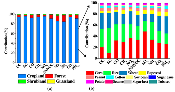 图2不同生物质类燃烧对各污染物排放的贡献