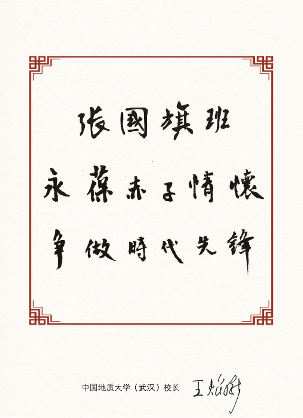 党委创新实施“张国旗班”行动计划,校长王焰新为“张国旗班”题名,并寄语青年学子:“永葆赤子情怀,争做时代先锋”。