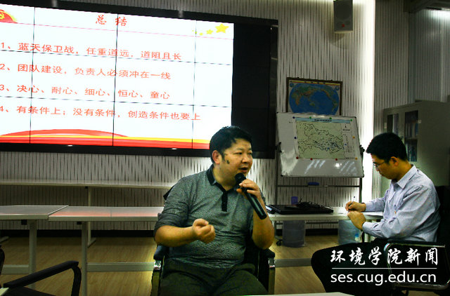 活动最后,许克学站长作总结讲话。他首先赞扬了地大源排放与区域大气环境团队师生在本职工作中很好的体现了此次主题教育的主题,在教书育人、以科研提升能力、为社会发展做好支撑和服务工作中,体现了担当。他指出,省站和地大,要开展更加紧密的合作,取长补短,为推动湖北省生态环境事业发展贡献力量。他强调,湖北省环境监测中心站四支部要加强和维持与大气科学系的合作,不仅要做好业务、科研的结合,还要搭建党建交流平台,实现良性互动和循环。最后,针对如何把工作做好,许站长谈了五点体会:(1)任何工作和事业都要确定好的目标,我们党要坚持两个一百年奋斗目标,我们个人要志向高远,脚踏实地;(2)任何工作和事业都要确定好路径,找准道路和方向更重要;(3)任何工作都不是轻易就完成的,道阻且长,我们唯有脚踏实地,埋头苦干;(4)共产党人要有坚韧不拔的毅力,所谓初心易得,坚持不易,每位党员同志要不怕苦,不怕死,以行百里者半九十的态度,走好每一步;(5)我们要保持严谨的态度,要坚持精益求精,所谓失之毫厘,谬之千里。要坚持高和严的标准,干好每一件工作,展现新时代新青年的精神风貌。许站长指出,随着省站和地大共建湖北省大气复合污染研究中心工作的推进,环境更好、条件更好、基础更牢,双方应更加紧密的交流合作,干好每一件事,为实现和守护湖北常态化的蓝天白云贡献力量。