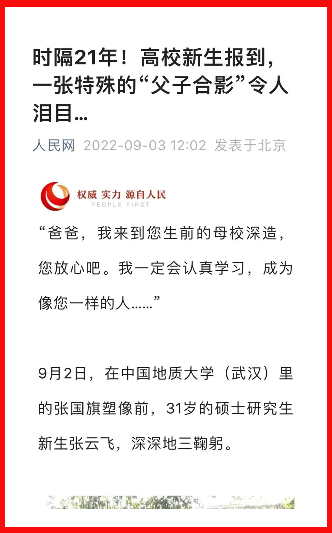 “向张国旗学习”成为幼年张云飞耳边听到最多的一句话。母亲教导张云飞:“孩子,你将来长大了,也要成为像你爸爸那样的人。”这句话沉甸甸的,一直记在他的心中。