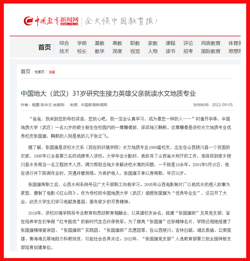 据张云飞介绍,张国旗殉职时,自己才10岁,“向张国旗学习”成为幼年的他耳边听到最多的一句话。2010年高考时,张云飞发挥失常,与父亲的母校失之交臂,被云南一所大学的地理信息系统专业录取。毕业后工作期间,看到“张国旗班”建设的系列新闻报道后,张云飞下定决心考研,继续攻读水文地质学专业研究生。2022年研究生入学考试中,他过关斩将,成功被中国地质大学(武汉)p站视频