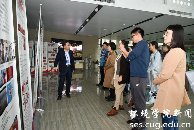 党建“双创”工作成果展板,李素矿重点讲解学院基本概况、党建工作体系、三全育人改革、跨学科教育研究、张国旗班行动计划、“4+N”美丽中国课程思政、“1+6”党建资政育人载体、兄弟院校交流互鉴、领导关怀指导和社会媒体反响等十个方面,全面反映了学院党委近年来党建示范创建和质量创优工作取得的创新性理论成果、制度成果、实践成果和特色成果,是环境人干事创业、追求卓越的汗水结晶。