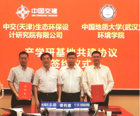 院长史建波与中交(天津)生态环保设计研究院有限公司(以下简称:中交生态环保院)董事长胡保安签订了《联合共建产学研基地合作协议》。天航局总经理周光涛、天航局科数部总经理秦亮,中国地质大学(武汉)校长王焰新、科学技术发展院常务副院长胡祥云、校友与社会合作处副处长袁江等见证双方签约。