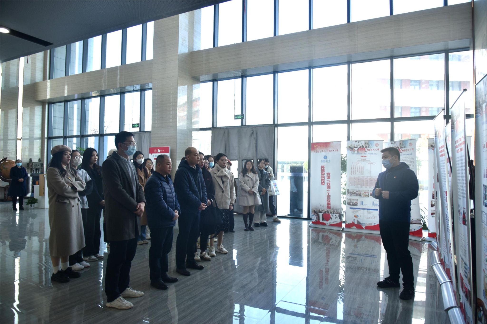 党建“双创”工作成果展,陈俊男重点讲解学院基本概况、党建工作体系、三全育人改革、跨学科教育研究、张国旗班行动计划、“4+N”美丽中国课程思政、“1+6”党建资政育人载体、兄弟院校交流互鉴、领导关怀指导和社会媒体反响等十个方面,全面反映了学院党委近年来党建示范创建和质量创优工作取得的创新性理论成果、制度成果、实践成果和特色成果,是环境人干事创业、追求卓越的汗水结晶。