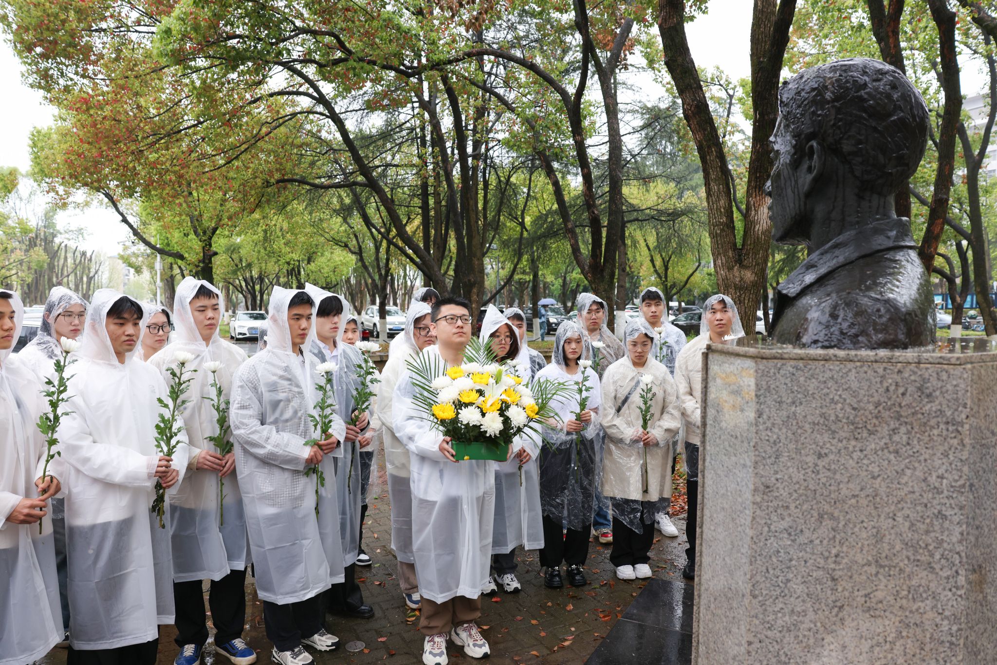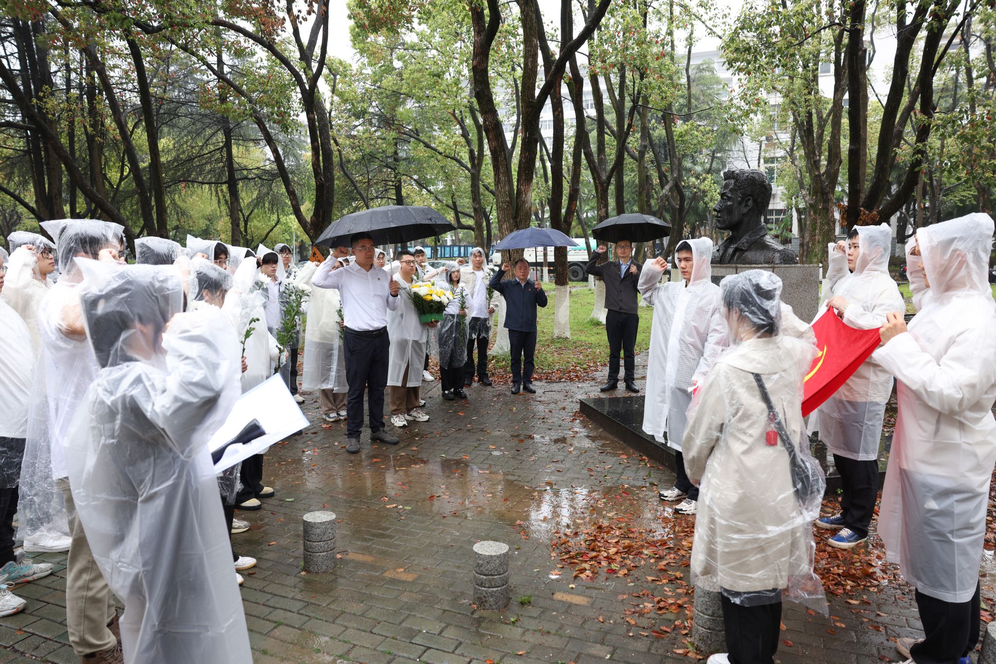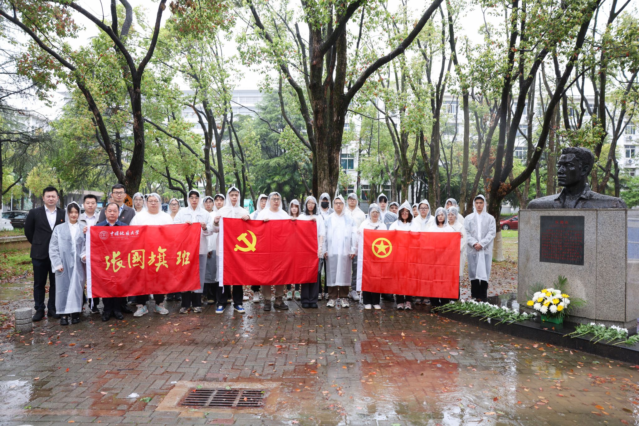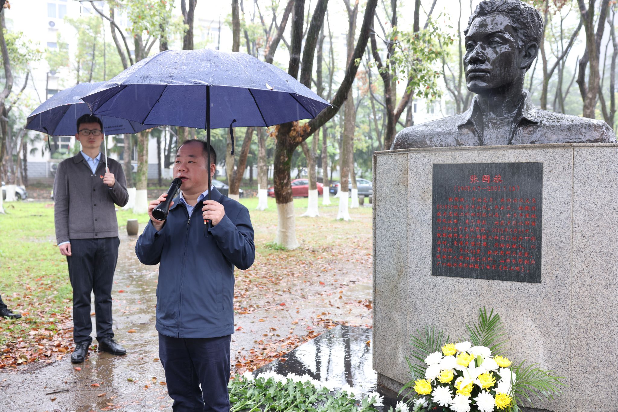 师生在张国旗雕像前举行致敬校友张国旗活动。“张国旗班”团支部书记彭锦蓉介绍张国旗校友生前事迹和“张国旗班”行动计划实施情况。“张国旗班”党支部书记韩鹏带领师生党员重温入党誓词。