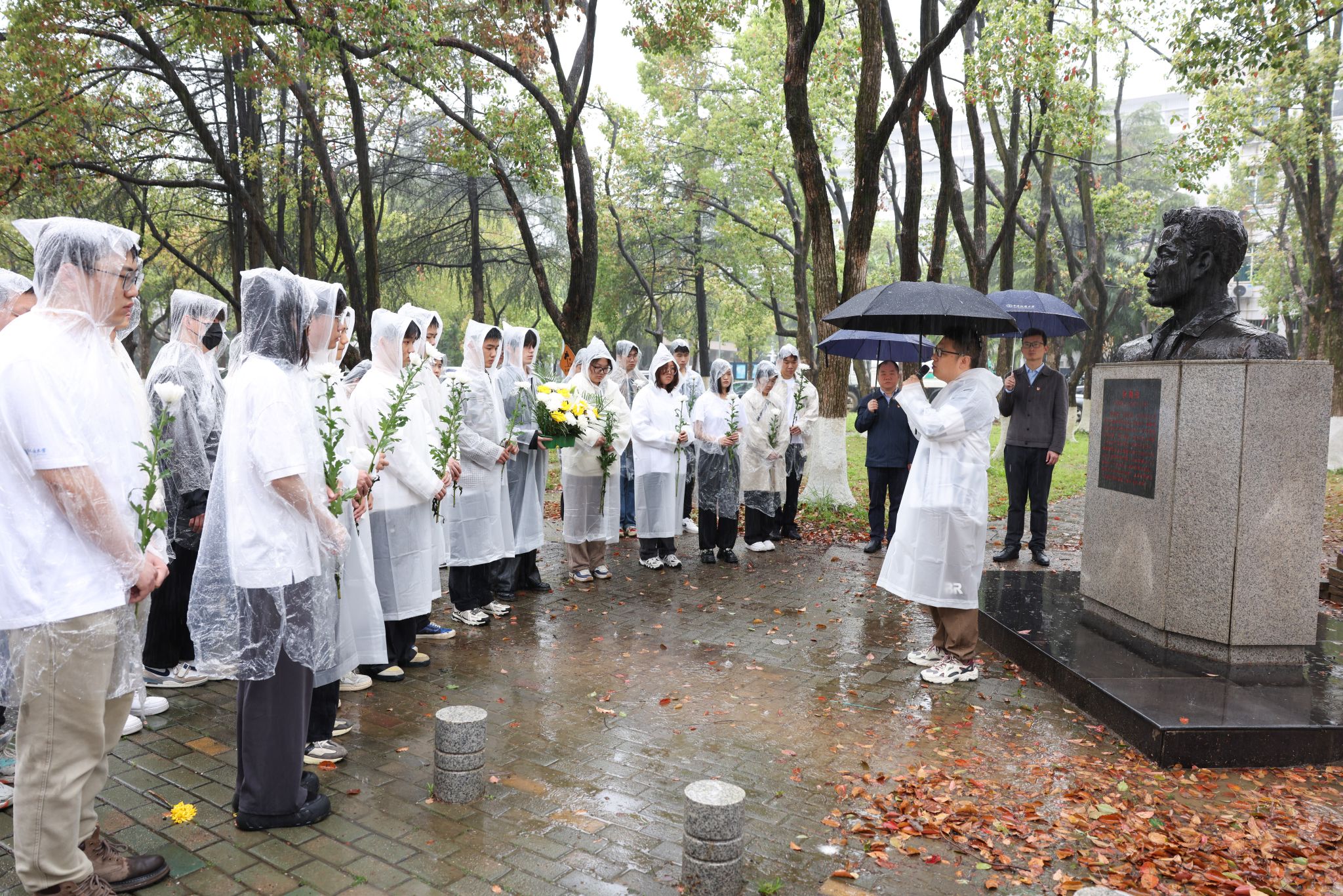 张云飞与全体师生向张国旗雕像献花并默哀一分钟。