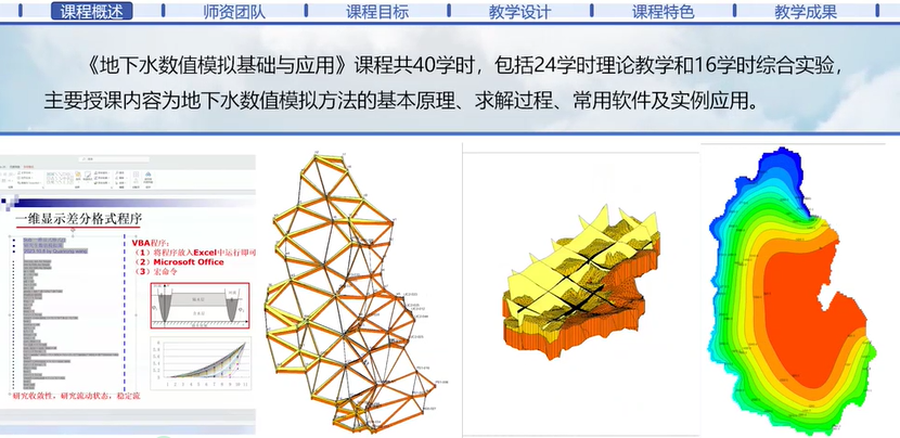 《地下水数值模拟与应用》课程是水文地质学、地下水科学与工程、水文与水资源工程、环境工程等专业的专业核心课程。本课程是定量研究岩土空隙介质中地下水运动规律的科学,主要应用领域包括:地下水资源评价、基坑排水方案优化、水库渗漏、海水入侵、地面沉降、CO2地质封存、地下水污染和修复、储气库选址等。目前课程团队共20余人,老中青结合,结构合理。团队坚持“学为主题,培养能力”的教学理念,更新教学案例,创新教学模式,训练“实验-编程-软件模拟”的求解思维。课程支撑了国家级一流本科专业与国家级教学成果奖。