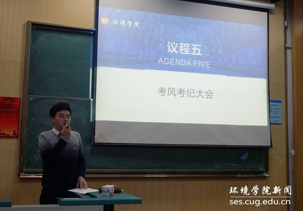 王碧宣读了学校教务处、学工处联合发布的《关于采取切实有效措施严肃考风考纪的通知》,领学了《中国地质大学(武汉)本科课程考核纪律与学术规范》、《中国地质大学(武汉)本科课程考核纪律处理办法》。通过学习校纪校规,加强学生诚信教育,帮助学生树立规矩意识。