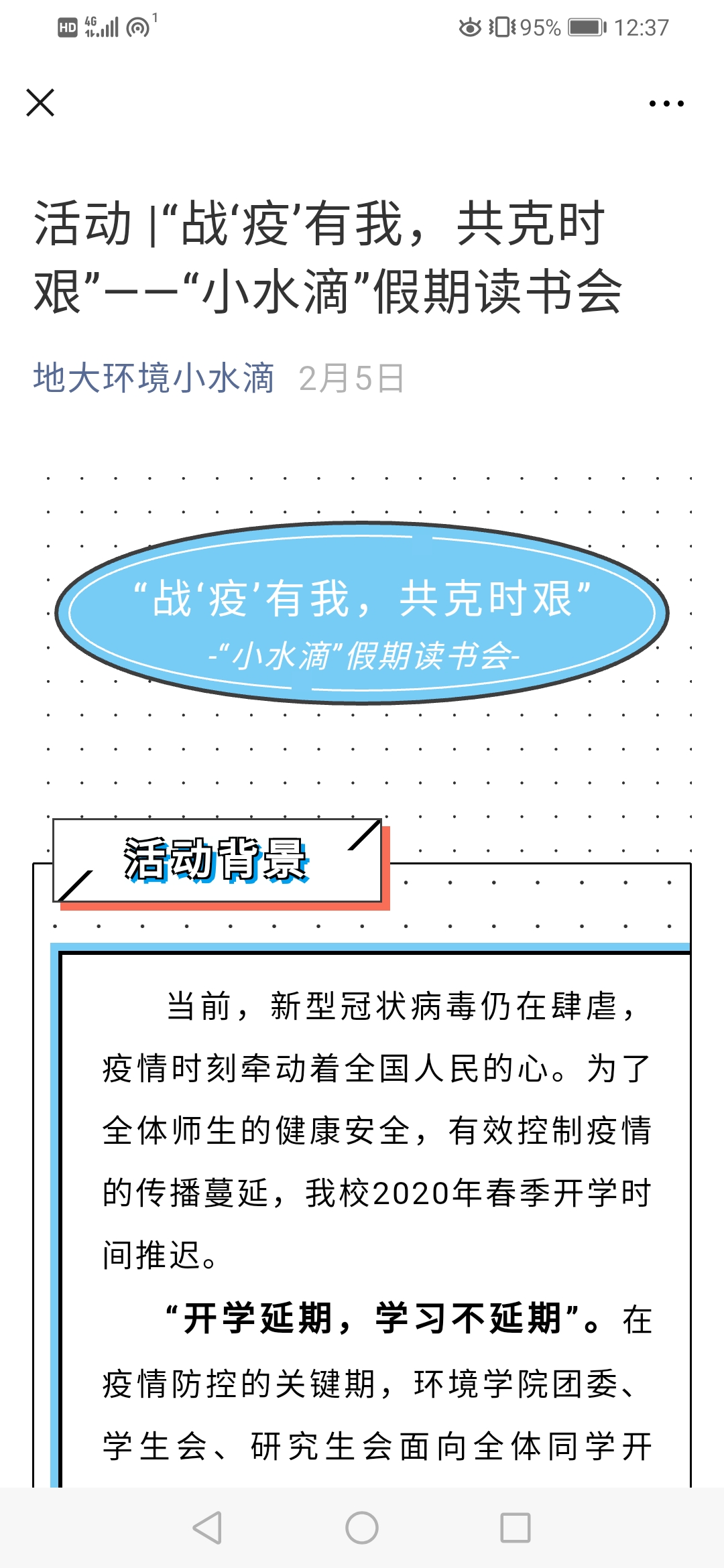 学习不延期,“灵魂旅行”不缺席。高校开学延期,但学习不延期。学院团委联合学生会、研究生会开展了“小水滴”假期读书会活动,倡导青年学子回归常识、守护初心,读中外经典、杜绝浮躁、理性思考,学知识、长本领。学生会制作了《疫情防控,我在行动》系列图片,传授科学防疫知识,号召青年学子力所能及为疫情防控做贡献。学院团委发布“小水滴”居家学习、生活系列表情包,以生动活泼的方式倡导青年居家坚持“十个做到”,自律学习、健康生活。