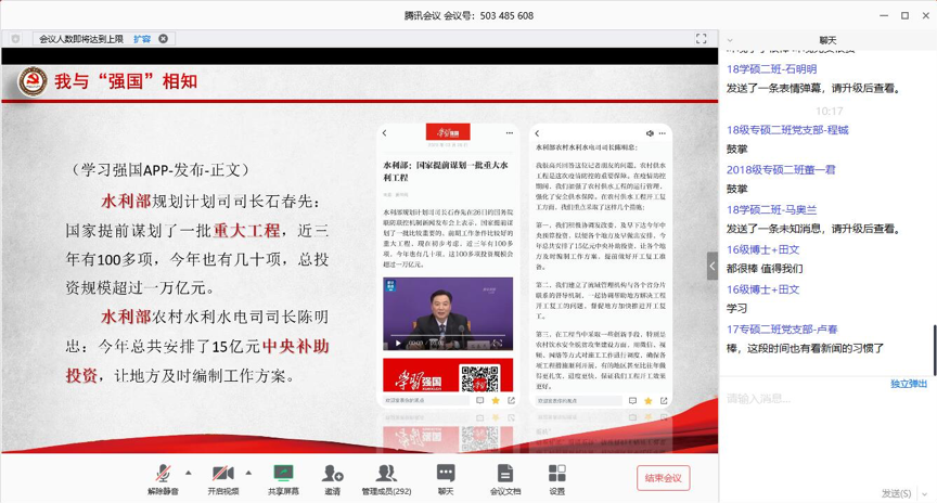 学院党委书记李素矿交流讲话。他说,新冠肺炎疫情是近段时间全世界、全社会、全人类共同话题和急需解决的难题,是一次挑战、一次大考。在疫情从高位、中位、低位的转变过程中,深切感受到了党的英明领导和国家的强大,感受到了学院师生党员志愿者的大爱情怀和担当精神。在全国、湖北武汉疫情防控工作中,习近平总书记亲自指挥、亲自部署,作了重要指示批示和重要讲话,他希望青年学生党员一定要认真学习领悟践行。特别要认真学习习近平总书记对北京大学90后党员回信精神。 “不畏艰险、冲锋在前、舍生忘死”是对90后党员的充分肯定;“不惧风雨、勇挑重担,让青春在党和人民最需要的地方绽放绚丽之花,”这是对每一位青年同学的希望寄托。青年一代有理想、有本领、有担当,国家就有前途,民族就有希望。他强调,要在战疫中提升个人的政治素质、完善党支部的政治功能、优化学院的政治生态,进一步增强“四个意识”,坚定“四个自信”,做到“两个维护”。 各党支部要联系关心在海外学习的同学,在做好个人防护前提下,积极参与社区小区的力所能及的志愿服务工作。他叮嘱同学们,疫情防控进入扫尾工作,一定遵循“坚定信心、同舟共济、科学防治、精准施策”的总要求,严格遵守当地政府社区规定做到不麻痹、不大意、不松劲,严格按照学校的统一要求做到不离家、不返校、不停学。居家学习生活期间,做到身体好、学习好、生活好。他还向同学们通报了学校和学院师生防疫战疫的安全保障、志愿服务、捐款捐物、教育教学、科研防疫、招生就业、总结“十三五”、谋划“十四五”、建设双一流、党建标杆建设等工作。