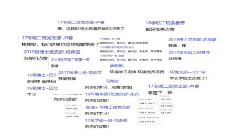 学院党委副书记姜明敏交流分享。他说,刚过去的寒假是一次特殊的“社会公开课”。作为学生党员,应该积极思考如何在争创全国党建工作标杆院系中发挥作用。他认为疫情防控给学生党员至少带来三点启示:一是在“四个意识”中坚定“四个自信”;二是在政治、思想、行动自觉中,实现平常时候看得出来、关键时刻站得出来、危急关头豁得出来;三是在线上、线下“两个场域”中做到“两个维护”。他希望环境学生党员在大爱教育中成长,做到爱党、爱国、爱家、爱校、爱学、爱习。学生党员在校期间就应该树立起“挑担意识”,期望大家以“学习强国”平台为抓手,争创学习型党支部,争做学习型党员。同时,结合学工组近期发布的网上学风建设十条,在网课学习中引领学风,当好先锋模范。