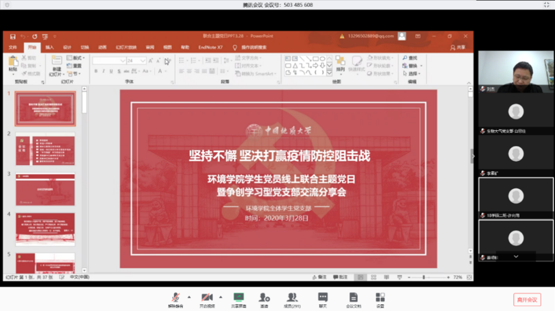 全体学生党员通过腾讯会议室以“坚持不懈 坚决打赢疫情防控阻击战”为主题召开线上联合主题党日暨争创学习型党支部交流分享会。副校长刘杰,学院党委书记李素矿、党委副书记姜明敏、学工组全体老师应邀参加会议,党建辅导员宋霖主持会议。