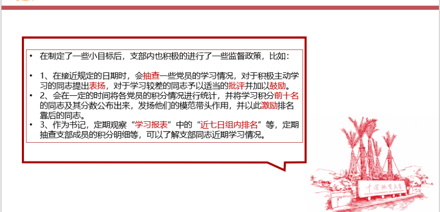 党支部书记定期观察“学习报表”中的“近七日组内排名”等,定期抽查支部成员的积分明细等,可以了解支部同志近期学习情况。对于学习效果不佳的同志,应及时鼓励,督促完成每日学习任务。通过有效利用学习积分这一功能,在支部内营造热爱学习、天天学习、你追我赶、共同进步的良好氛围,充分调动党员自我学习的热情和积极性,并引导大家在工作中也要发挥主观能动性和模范带头作用,多拼搏奉献、多创造佳绩。