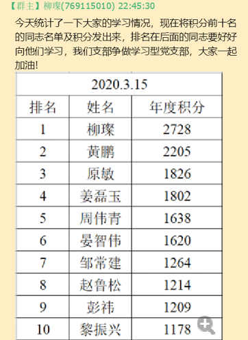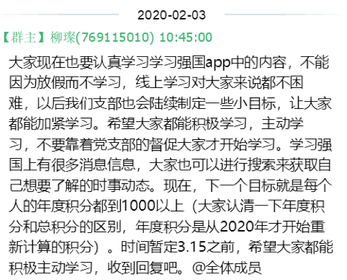 2020年2月初,在抗击疫情的重要关键时期,由于党支部无法开展相关线下的活动,于是经党支部委员的讨论,党支部也制定了一些线上的学习计划,首先就是需要依靠“学习强国”APP去了解相关的疫情防控最新消息、了解一些时事热点等等。同时要求支部党员们的年度积分在3月中旬期间要达到1000分及以上。