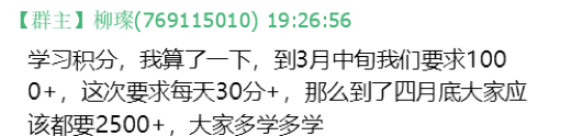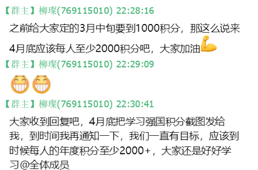 2020年3月初,应学校党委关于党员们在“学习强国”APP上学习的要求,党支部又制定了一个小目标,在前一个目标的基础上,要求支部各党员的年度积分在4月底均达到2500分及以上。