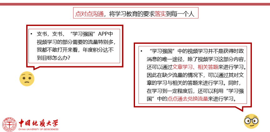 党支部书记柳璨回应:“学习强国”中的视频学习并不是获得时政消息的唯一途径,除了视频学习这部分内容,还可以通过文章学习、相关答题来进行学习。因此在缺少流量的情况下,可以通过其对文章的学习与相关的答题来进行学习。同时,在学习到一定程度后,还可以利用“学习强国”中的点点通去兑换流量来进行学习。