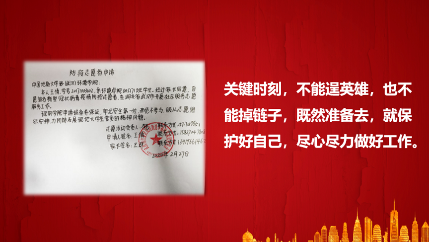 (通讯员王倩、宋霖 编辑耿婧)疫情爆发,武汉封城,地下水专业大学生党支部的党员同志王倩,响应号召留在了武汉,留汉的日子里,王倩同志和姐姐一起加入了武汉疫情防控青年志愿者团队,王倩同志的父母也在家乡负责着疫情防控的相应工作。一家四口,两地分隔,却在共同为着早日战胜疫情在努力。