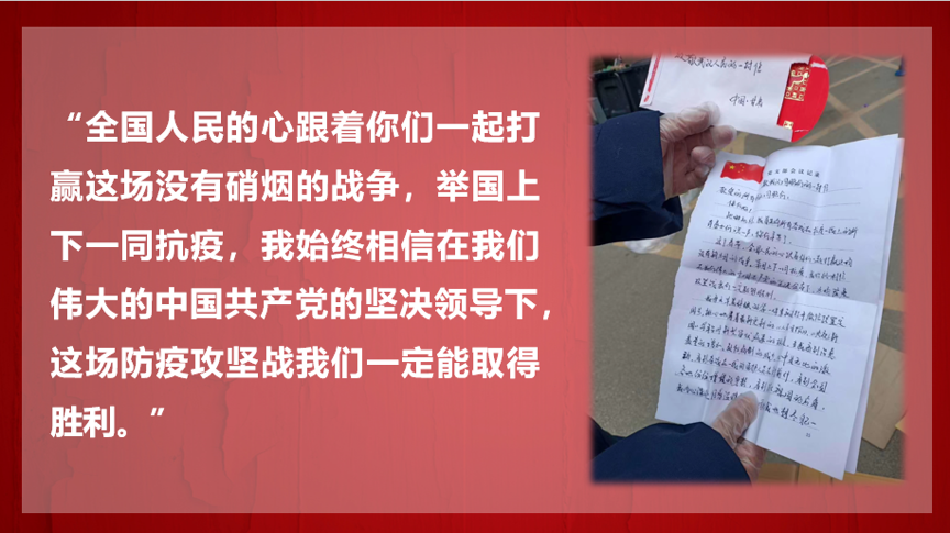 疫情期间全国人民同下一盘棋,同心战疫情,身在武汉的我们倍感温暖。我所在的社区就收到了来自全国各地的物资。志愿者会协同社区把这些物资送到每家每户。我们有一天收到了甘肃静宁县800多户乡亲的3000箱苹果。在分发苹果时,我们翻出了来自甘肃的一个党支部的一封信,他们用红包糊了一个信封写道:“全国人民的心跟着你们一起打赢这场没有硝烟的战争,举国上下一同抗疫,我始终相信,在我们伟大中国共产党的坚决领导下,这场防疫攻坚战我们一定能取得胜利。”我所在的社区每家每户都分到了八个苹果,后来我了解到甘肃静宁县属于国家扶贫开发工作重点县六盘山片区特困地区和甘肃省23个深度贫困县之一。此外,我所在的社区还收到了来自广东湛江徐闻县的辣椒茄子等物资,志愿服务期间我们还收到了不同地区送来的鸡蛋、香菇、饮料等,这些物资分别送给了65岁以上的老人、雷火方舱医院的建设者和15岁以下的小孩。这些菜很快走上了居民的餐桌,还有居民调侃因为多了辣椒多吃了两碗饭。这些都让我深深感受到了万众一心,众志成城共同抗疫的决心和全国人民的爱心。