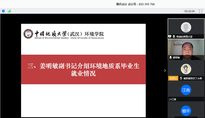 姜明敏副书记介绍环境地质系毕业生就业情况。他讲到,今年就业形势异常严峻,目前学院整体就业情况不容乐观。他希望,全系教师能够针对毕业去向尚未确定群体开展结对帮扶,掌握同学们的实际情况,精准指导同学们尽早就业。毕业生们要树立“先毕业后就业”、“先就业后择业”、“先职业后事业”的正确观念,尽早落实毕业去向。