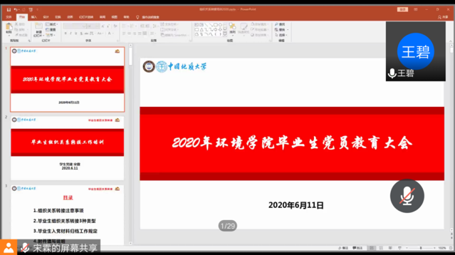 学院党委副书记姜明敏与毕业生党员对话交流。他说,受疫情影响,今年的毕业季是一个特殊的毕业季,这一届毕业生也是特殊的毕业生,参会的党员同志们更是特殊的毕业生党员。2020年的毕业季,大家注定记忆深刻。这个时代会让大家留下深刻记忆,这是一个我们与祖国共同奋斗、共同进步的新时代;严峻形势会让大家留下深刻记忆,因为今年是与众不同的一年;身份会让大家留下深刻的记忆,各位既是毕业生,又是党员的身份,肩上承载的是更多的担当、奉献和付出。不凡的2020届毕业生党员同志,未来注定道路不凡,身为地大学子,必定会传承校训精神,勇攀高峰,追求卓越,共同建设美丽中国;身为环院学子,定会弘扬学院红专能优品格,做一名合格毕业生党员,争当生态环保铁军;作为一名环境人,要继续发扬特别能吃苦、特别能奋斗、特别能奉献的优秀传统,在走上社会后,成就自己不凡的道路。最后,他叮嘱同学们能够做到有序错峰返校,规范留校,文明离校。