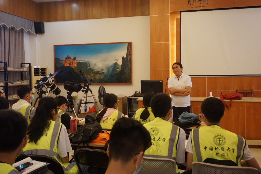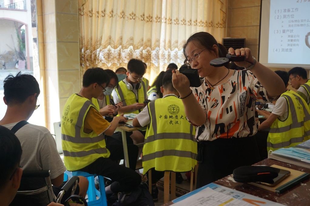 实习教学第一课在室内进行。邢新丽老师详细讲解了野簿记录方法,并就罗盘使用的方法进行针对性的指导。刘邓老师对丹霞山世界地质公园的区域地质背景进行了详细的讲解,并对《普通地质学》课程中相关知识点进行回顾,为野外实习做好充足的知识储备。