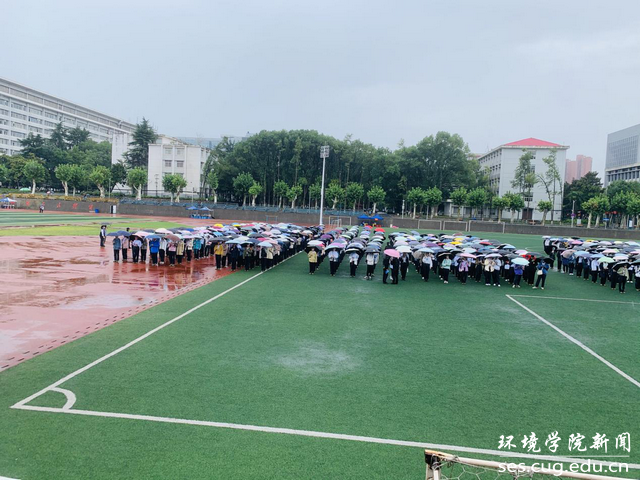 蝉鸣谢幕,梅雨季的细雨裹挟阵阵寒意,随着清晨的第一声鸟鸣划破沉寂,莅临人群尚稀疏的中国地质大学,然而就在片刻以后,这样的寂静便会被驱逐出境,取而代之的是少年的欢笑声和三两结伴的打闹声——即使是细雨侵扰,环院学子依旧没有畏缩在温暖的宿舍,而是选择了换上可以御寒的薄外套继续训练。站在运动场旁本是可以看见一顶顶蓝色迷彩的帽子整齐划一,而此刻被色彩斑斓的伞替代,少了些统一的美,却因为坚持精神的点缀而不失该有的和谐。主席台上掷地有声的致辞与落下的雨滴一起在深深浅浅的水洼中炸开泥土的缄默,为阴沉的天幕渲染出浓墨重彩。