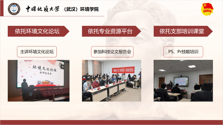 支部借助学院主页开设“张国旗班行动计划”专题栏目、“地大环境小水滴”微信公众号开设“张国旗班风采”专栏,讲述支部故事;参与制作“我最喜爱的习近平总书记的一句话”系列明信片及支部文创周边。