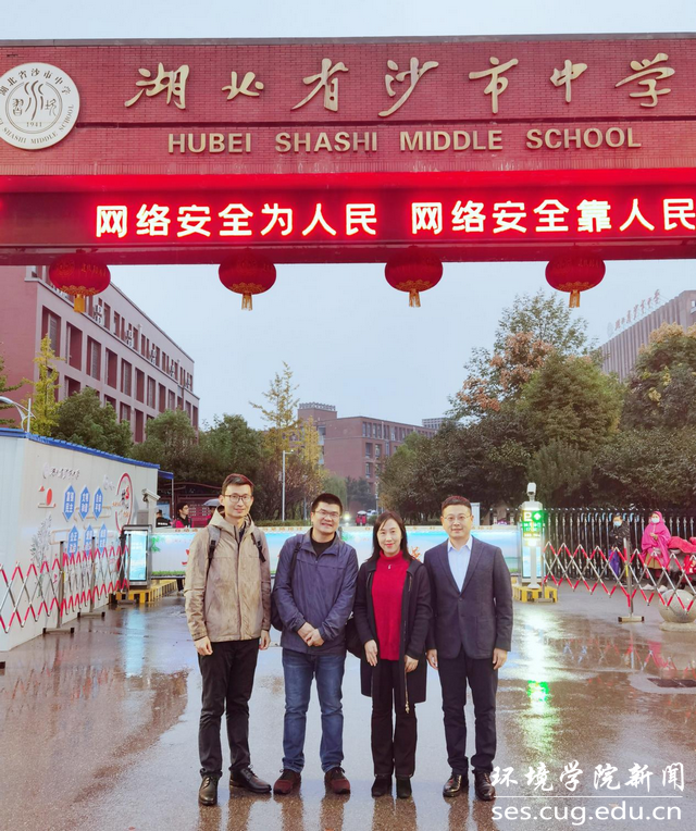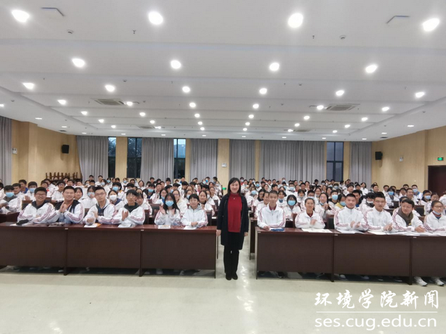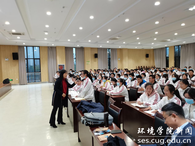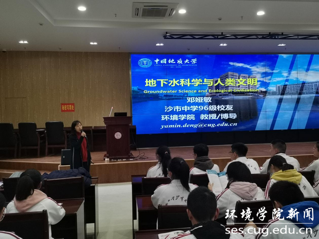 随后,邓娅敏教授面向沙市中学学生开展题为“地下水科学与人类文明”的科普讲座。她从地球上的水与水循环、井、泉与人类文明、地下水与生态文明、水的人生哲理等方面深入浅出地向同学们介绍了地下水相关知识,并与现场师生进行互动交流和感悟分享。她结合个人成长经历,勉励同学们认真学习,报考中国地质大学(武汉),在服务美丽中国、宜居地球建设中实现梦想、贡献力量。