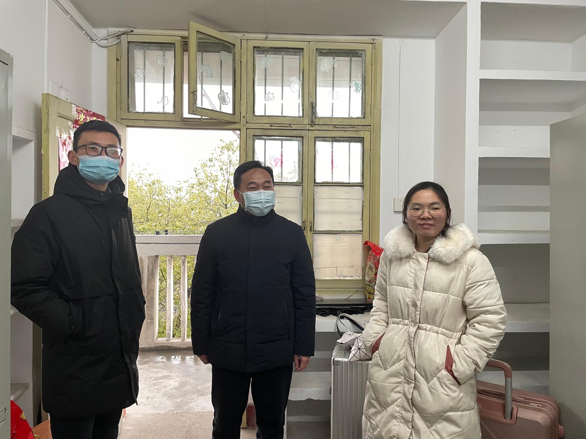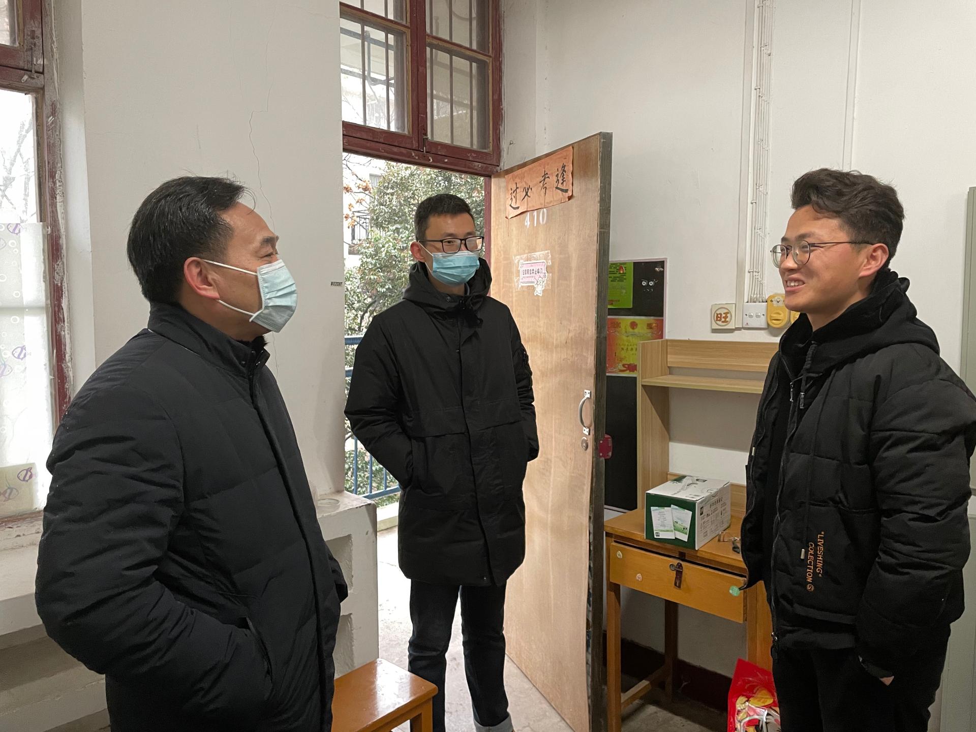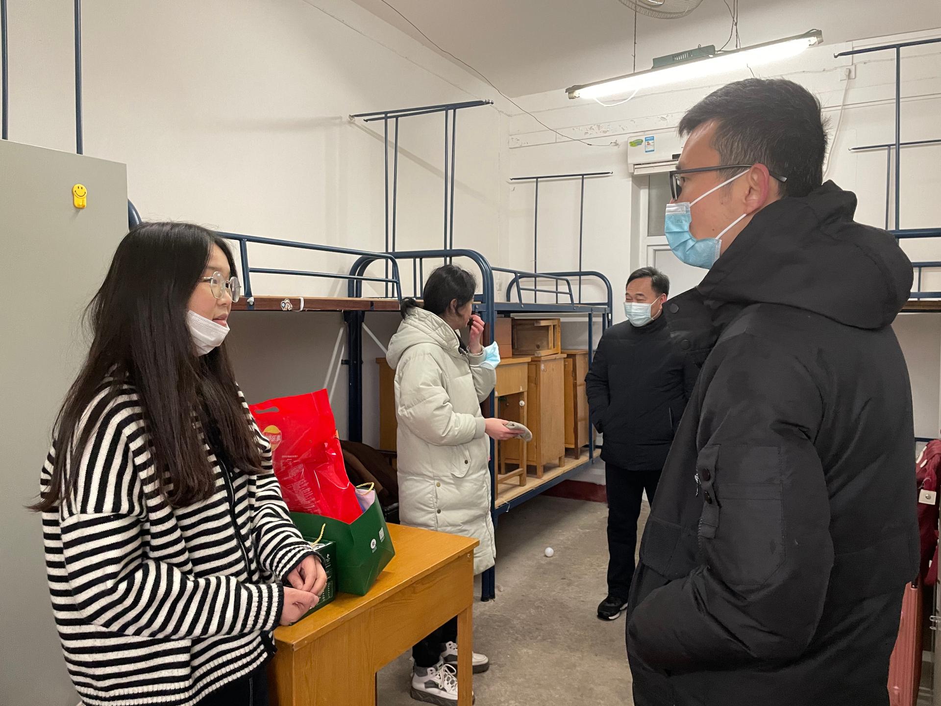 通讯员孟庆达  摄影/编辑耿婧)1月28日下午,学院党委书记李素矿,党委副书记王海锋,中加合作办公室学生事务秘书耿婧前往南望山校区54栋、57栋学生宿舍看望春节留校的5名研究生,代表学院送上新春祝福。