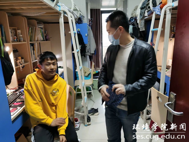 王海锋一行先后走访本科生、研究生宿舍,与同学们亲切交谈,详细了解大家的学习生活情况。他们仔细检查宿舍卫生状况,叮嘱同学们要保持良好生活习惯,要勤通风、勤洗手、勤消毒,共同维护好宿舍卫生环境。他们提醒同学们要继续强化疫情防范意识,并向大家解读目前学校的疫情防控政策,听取大家对学校疫情防控政策的建议和意见,对同学们日常生活中遇到的困难与需求及时给予了意见和反馈。同时,他们叮嘱同学们要严格执行出校审批制度,把握好请销假时间节点,与导师和辅导员勤沟通、多交流。