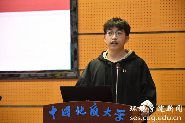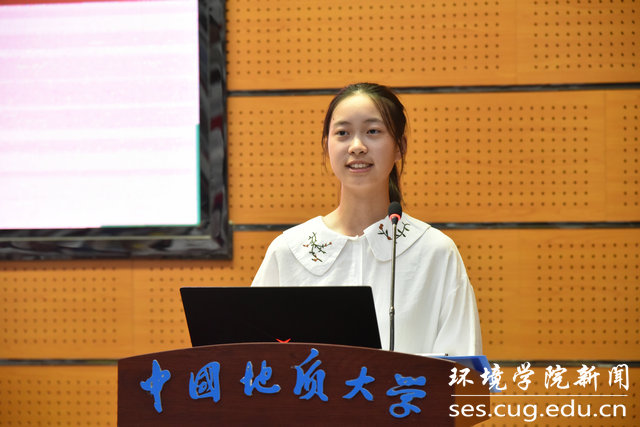 新生代表史馨怡从家乡入题,她分享了自己对环境重要性的认识,并展望大学生活,号召全体新生坚持目标,规划道路,真诚交往。最后,她提出青春的誓言:若你决定灿烂,山无遮,海无拦。