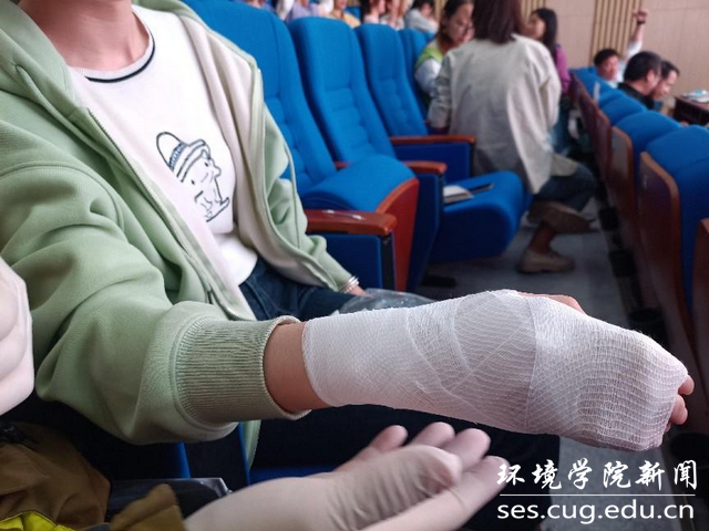 傅建萍介绍了国内AED(自动体外除颤仪)的使用情况,并现场演示了手套的正确脱取,以及冰袋、急救毯、碘伏棉棒的使用方法。她详细演示了止血带的正确使用方式和如何在不同部位加压止血,以及骨折时的夹板固定等。