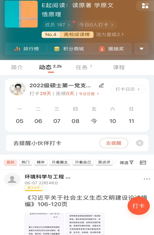 学生党建中心举办“‘E’起阅读:读原著、学原文、悟原理”习近平生态文明思想读书打卡活动,扎实推动主题教育走深走实、取得实效。