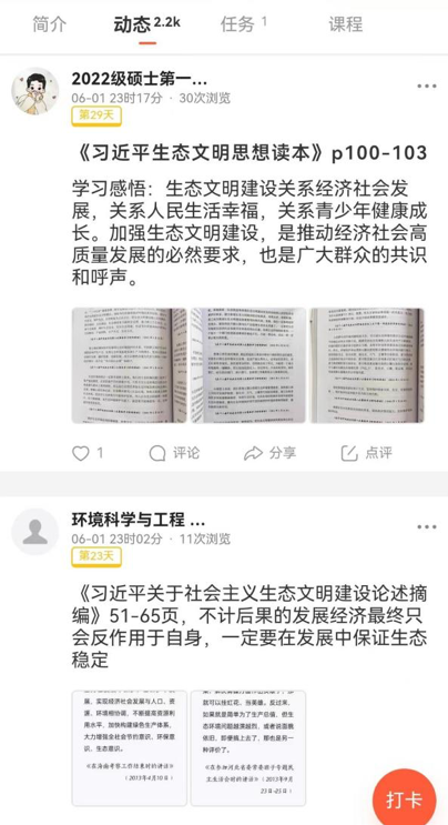 习近平生态文明思想是习近平新时代中国特色社会主义思想的重要组成部分,是马克思主义基本原理同中国生态文明建设实践相结合、同中华优秀传统生态文化相结合的重大成果,为建设人与自然和谐共生的现代化提供了根本遵循和行动指南。通过本次阅读打卡活动,激励全体环境学子把青春理想融入到“中国梦”的伟大实践、融入到“地大梦”“环境梦”的具体行动。