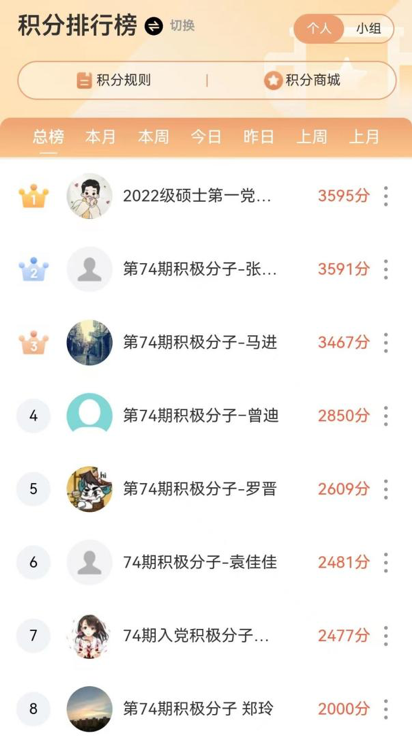 本次活动依托微信小程序“小打卡”开展,记录统计参与活动的党员、发展对象与入党积极分子的每日学习情况,实时更新积分排名。活动历时一个月,近200名同学参与。2022级硕士研究生第一党支部党员黄聪明累计学习打卡29次,积分3595分,位列排行榜第一,充分发挥党员先锋模范作用。马进、张克霖等入党积极分子累计学习打卡28次,积分达到3000分以上,通过理论学习,持续提升个人思想理论素养。