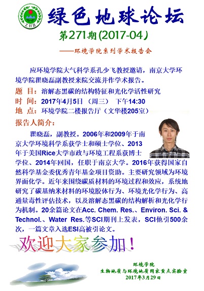 副教授。2006年和2009年于南京大学环境科学系获学士和硕士学位、2013年于美国Rice大学市政与环境工程系获博士学位、2014年回国,任职于南京大学。2016年获得国家自然科学基金委优秀青年基金项目资助。主要研究领域为环境界面化学。近年来围绕碳质材料的环境过程和效应,系统地研究了碳基纳米材料的环境胶体行为、环境光化学行为、高通量毒性评估技术,以及溶解态黑碳的结构解析和光化学行为机制。20余篇论文在Acc. Chem. Res.、Environ. Sci. & Technol.、Water Res.等SCI期刊上发表,SCI他引500余次,一篇文章入选ESI高被引论文。