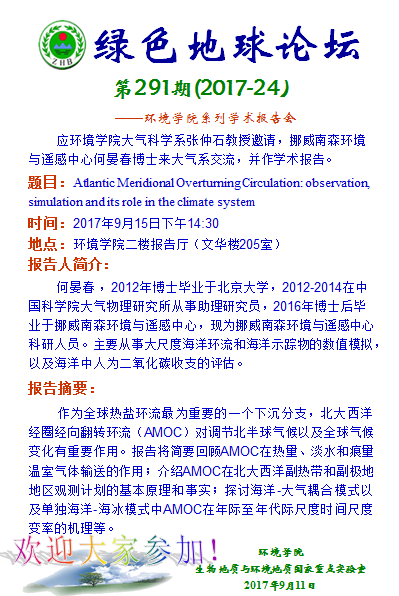 绿色地球论坛第291期(2017-24) ——p站视频 系列学术报告会 题目:Atlantic Meridional Overturning Circulation: observation, simulation and its role in the climate system (北大西洋经圈翻转环流的观测、模拟及其在气候系统中的作用) 时间:2017年9月15日下午14:30 地点:p站视频 二楼报告厅(文华楼205室)