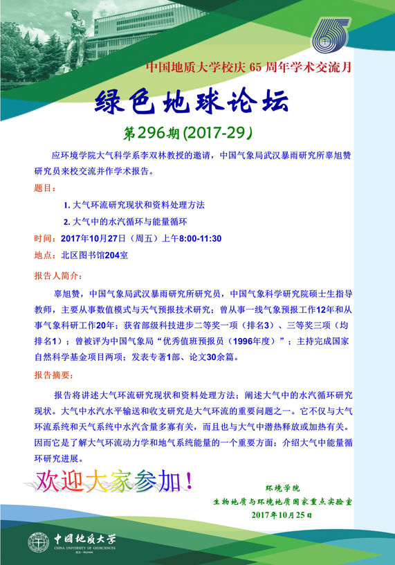 绿色地球论坛第296期(2017-29) ——p站视频 系列学术报告会 题目: 1. 大气环流研究现状和资料处理方法 2. 大气中的水汽循环与能量循环 时间:2017年10月27日(周五)上午8:00-11:30 地点:北区图书馆204室