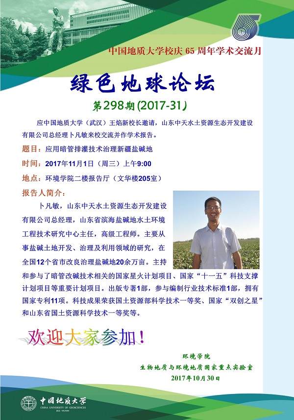 绿色地球论坛第298期(2017-31) ——p站视频 系列学术报告会 题目:应用暗管排灌技术治理新疆盐碱地 时间:2017年11月1日(周三)上午9:00 地点:p站视频 二楼报告厅(文华楼205室)